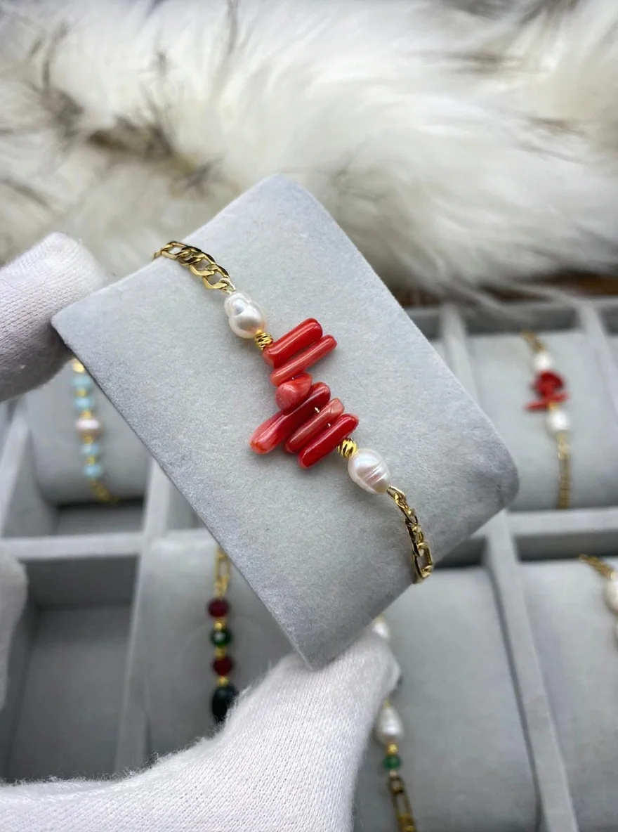 Gourmette en corail rouge ( Lmarjane ) et perle de culture ( joher hor ) avec une chaine plaquée en Or 18k